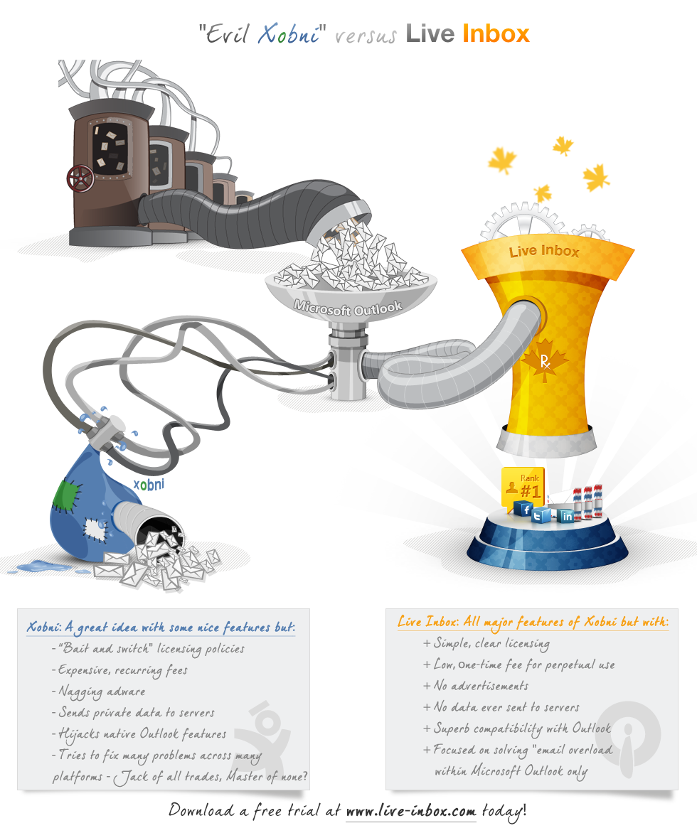 All useful Xobni features - for a low, one-time feeLive Inbox offers all the major features of Xobni - indexing multiple PST files, automatic rich profiles for all contacts, social network integration, email and attachment history for each contact, lightning fast search and a ranked address book. We are not replicating some features especially those that we belive add no real value and/or hijack override native Outlook functionality (no autosuggest override for instance). All of this for a small one-time fee that lets you use Live Inbox for life. Recover your investment in days by radically improving the way you work with your email.Contrast this with Xobni's licensing regime that requires you to pay a monthly fee of $9.99 perpetually to access data that resides on your system and belongs to you! What's more, we promise that this version will be in vogue for the entire period that the company is in existence and we will never resort to bait-and-switch changes in licensing policy. |